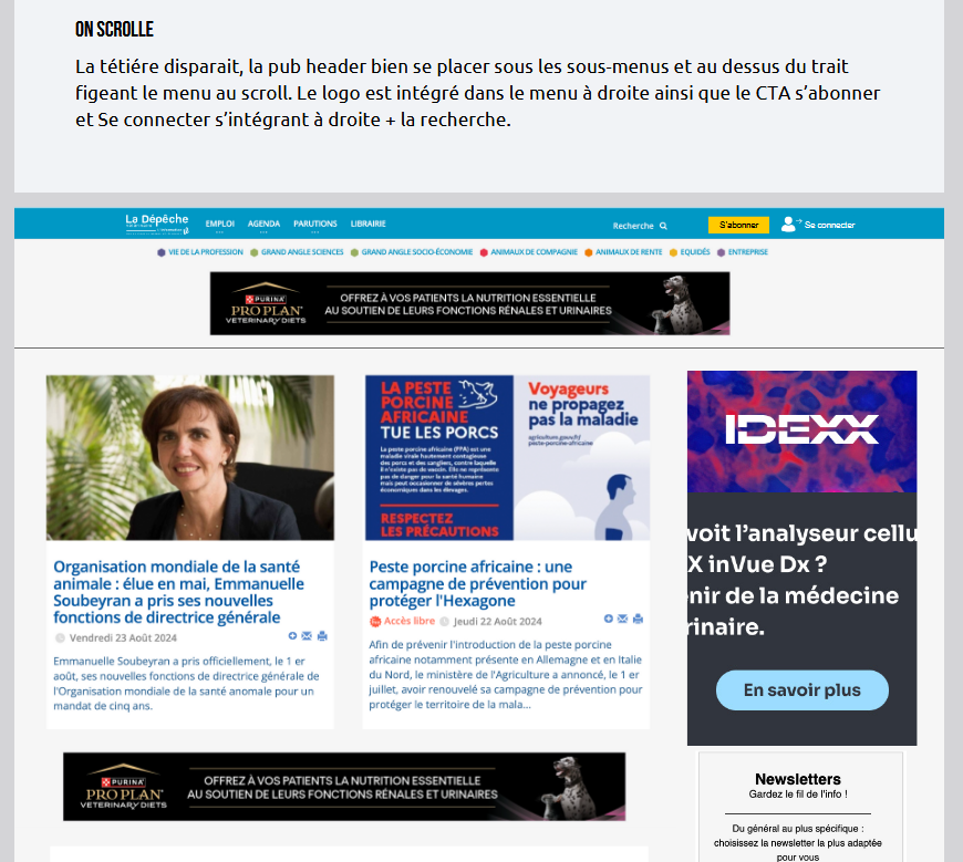 Lors du scrool : La tétiére disparait, la pub header bien se placer sous les sous-menus et au dessus du trait
