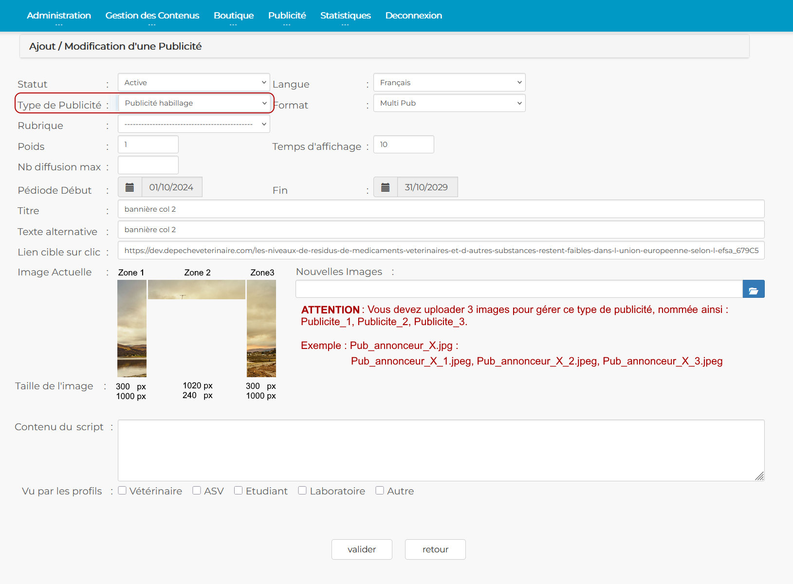 Modification du backoffice pour gérer ces nouveau support (voir maquette)